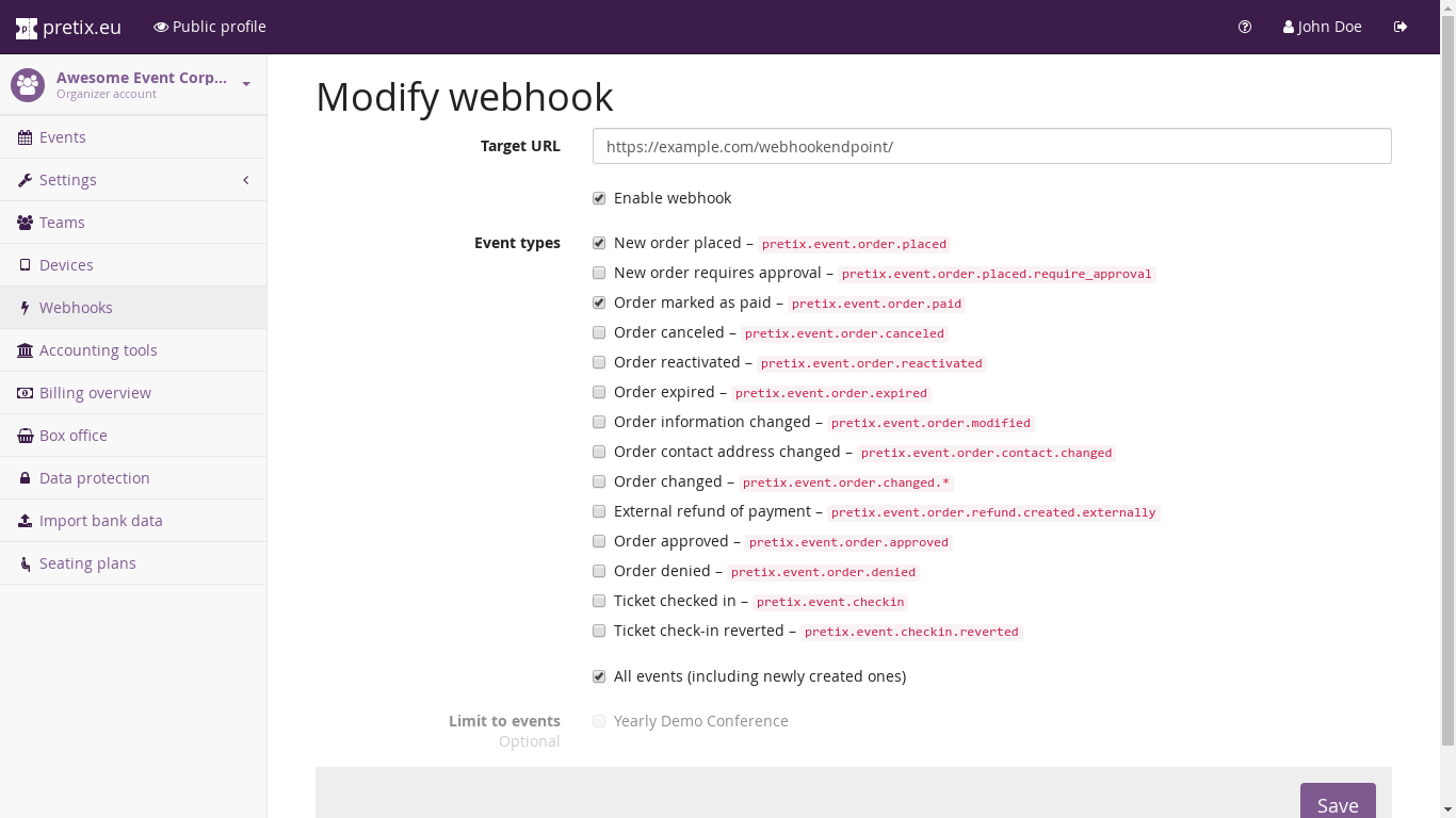 Click “Create webhook” if you want to add a new URL. You will then be able to enter the URL eventyay shall call for notifications. You need to select any number of notification types that you want to receive and you can optionally filter the events you want to receive notifications for.