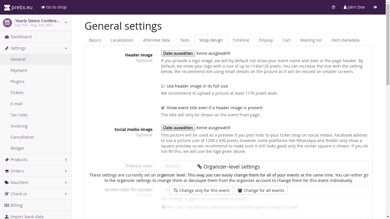 The lower part of the page contains settings that you can either set on organizer-level for all your events or override for this single event individually. Those are: