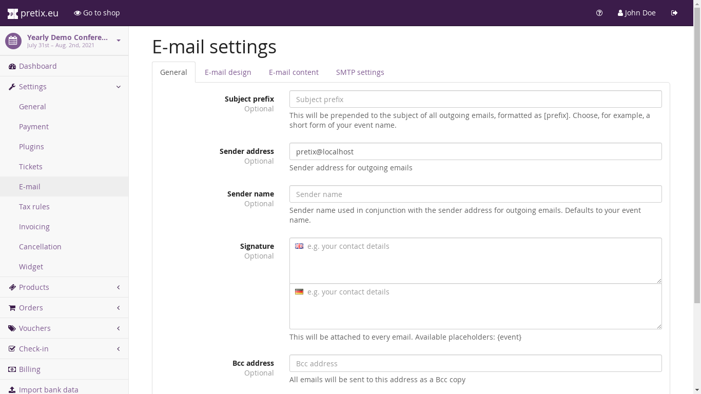 The settings at “Settings” → “E-mail” allow you to customize the emails that eventyay sends to the participants of your event.