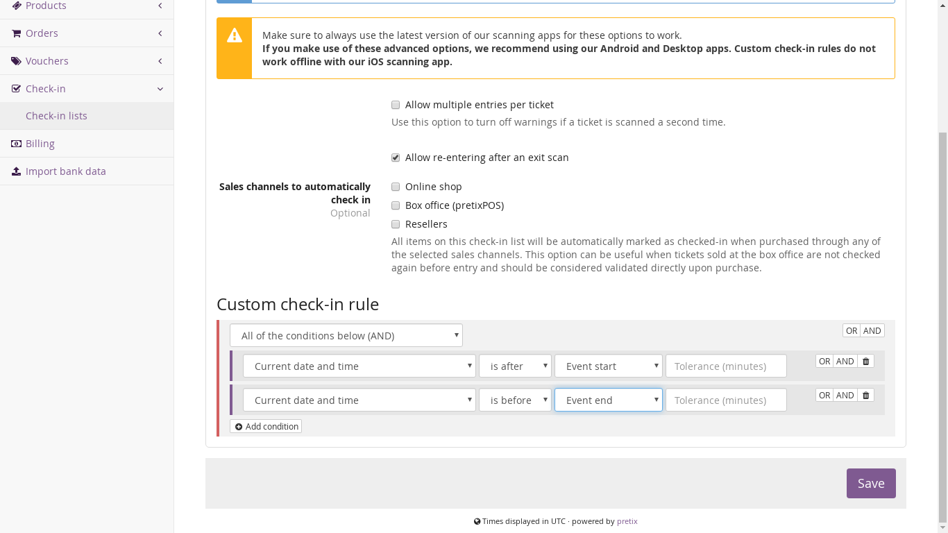 If you want to scan people at the entrance of your event and only admit them at their designated time, we recommend the following setup: Go to “Check-in” in the main navigation on the left and create a new check-in list. Give it a name and do not choose a specific data. We will use one check-in list for all dates. Then, go to the “Advanced” tab at the top and set up two restrictions to make sure people can only get in during the time slot they registered for. You can create the rules exactly like shown in the following screenshot: