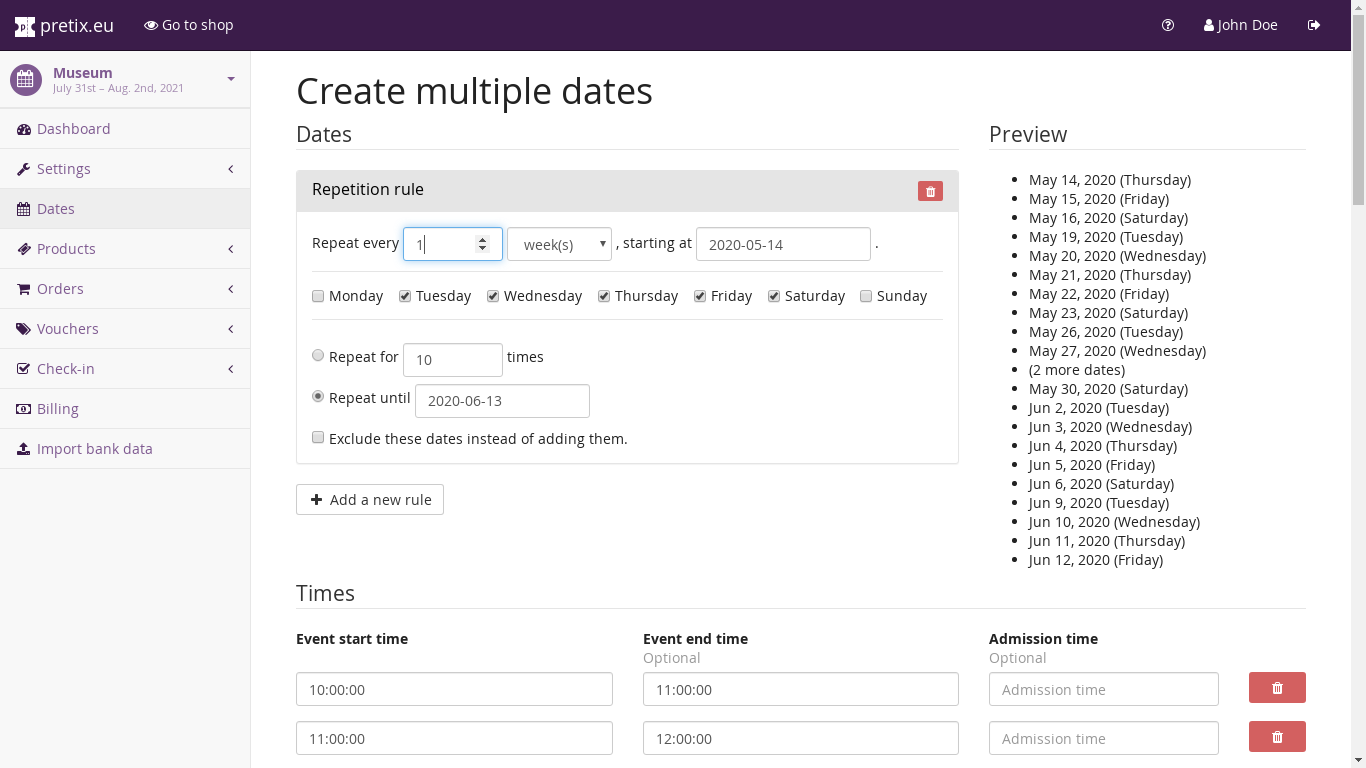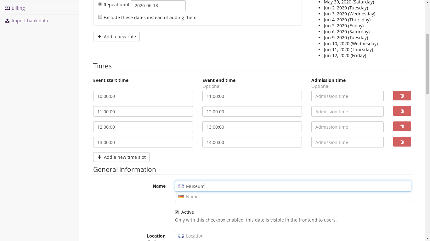 To create the time slots, you need to create a number of “dates” in the event series. Select “Dates” in the navigation menu on the left side and click “Create many new dates”. Then, first enter the pattern of your opening days. In the example, the museum is open week Tuesday to Sunday. We recommend to create the slots for a few weeks at a time, but not e.g. for a full year, since it will be more complicated to change things later.