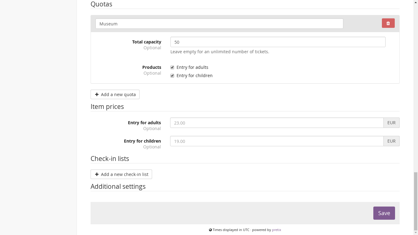 Scroll further down and create one or multiple quotas that define how many people can book a ticket for that time slot. In this example, 50 people in total are allowed to enter within every slot:
