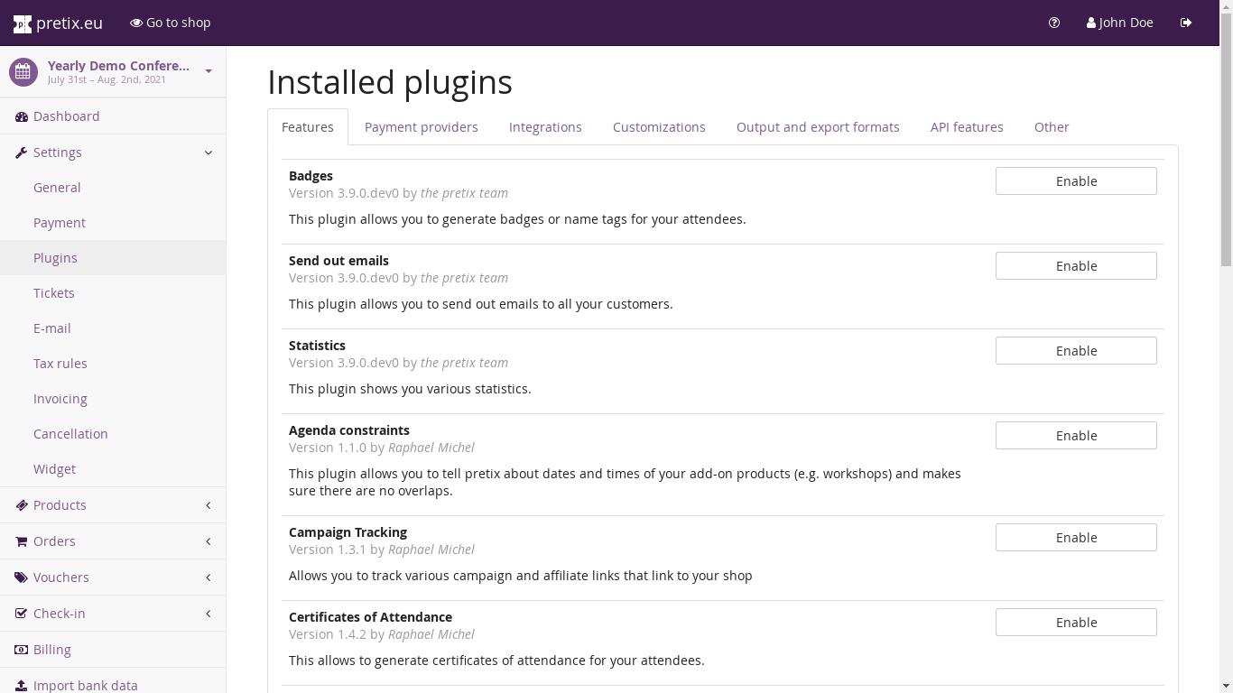 For each plugin, you will find a short description as well as an Enable/Disable button. The eventyay website has an overview of available plugins and more details of them. If you are on the eventyay.com hosted service, look for the “eventyay Hosted” badge in the plugin list to learn which ones are supported there.