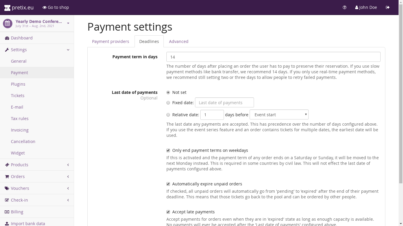 There is probably no use for payments received after your event, so you can set a date that the payment deadline of a new order will never exceed. This has precedence over the number of days configured above, so if I create an order two days before the configured last date of payments, my payment term will only be two days, not ten. If you have payment methods that always require some time (like bank transfer), you will later be able to selectively disable them once the event comes closer.